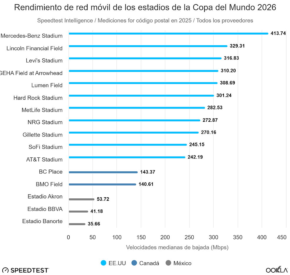 El informe,que examina la infraestructura de conectividad en los 16 estadios distribuidos entre los tres países anfitriones,revela disparidades significativas en el rendimiento de red. Mientras que el Mercedes-Benz Stadium en Atlanta alcanza velocidades medianas de descarga de 413.74 Mbps,los tres estadios mexicanos,Estadio Akron en Guadalajara,Estadio BBVA en Monterrey y Estadio Banorte en la Ciudad de México,registran velocidades de apenas 53.72,41.18 y 35.66 Mbps,respectivamente.